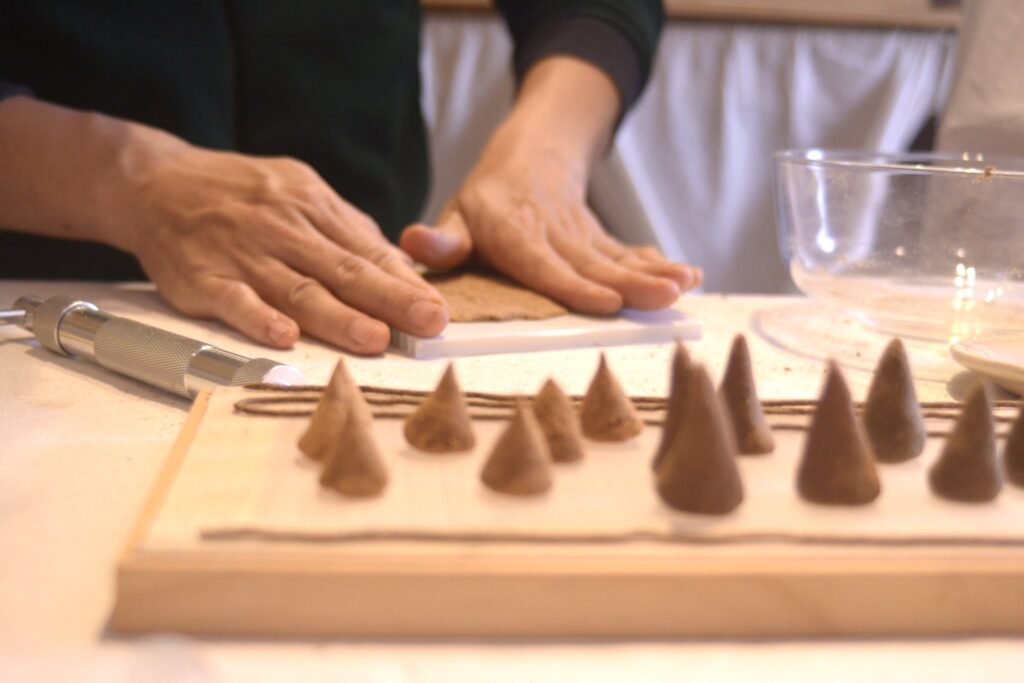 Nụ nói chung, thường được làm theo cách tương tự như nhang que không có lõi tre. Để dễ hình dung, bạn có thể coi nó như một “phiên bản khác” của nhang que không lõi, nhưng thay vì tạo thành que dài và mỏng, khối bột được nén vào khuôn thành hình nụ và phơi khô.