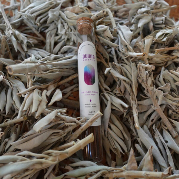Nụ xô thơm trắng tại Quinta được làm từ 90% lá xô thơm nghiền mịn, kết hợp với 10% keo bời lời, tạo nên hương thảo mộc đặc trưng – bạc hà, long não, xạ hương và một chút mùi đất ẩm, cây cỏ khô. Xô thơm là loại thực vật đặc biệt khi có sự pha trộn hài hòa của hương cay nồng lẫn ngọt ngào, thanh mát tạo nên hương thơm sâu lắng và trong trẻo, vừa giúp cân bằng vừa thư giãn, đạt đến sự hòa hợp từ bên trong. Không gian của bạn không chỉ được thanh tẩy mà còn mang lại cảm giác sạch sẽ, tinh tươm.